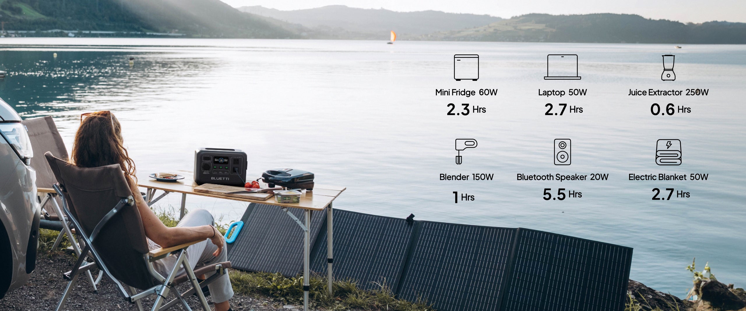 268Wh2x120v (600W au total)350 max200W Max.LifePo₄ 2500+ cyclesBluetti App (Bluetooth)10.0x7.1x7.210.1 lbs