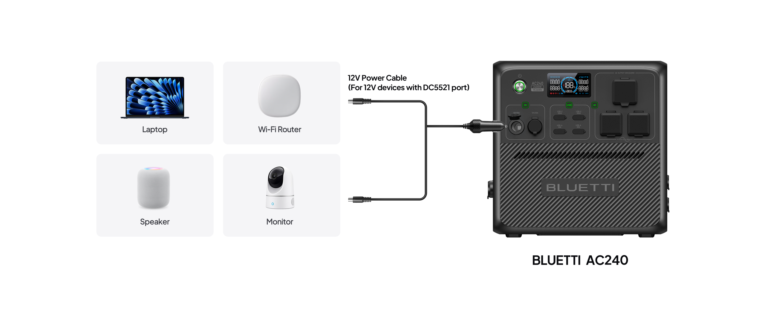 AC60/AC180/B230/B300-12V: Convert the cigarette lighter port on your AC60, AC180, B230, or B300 to a DC5521 port with this cable, and you're all set to power your LED strips, GPS units, cameras, mini fans, vacuum cleaners, DVD/CD players, and other 12V devices.
