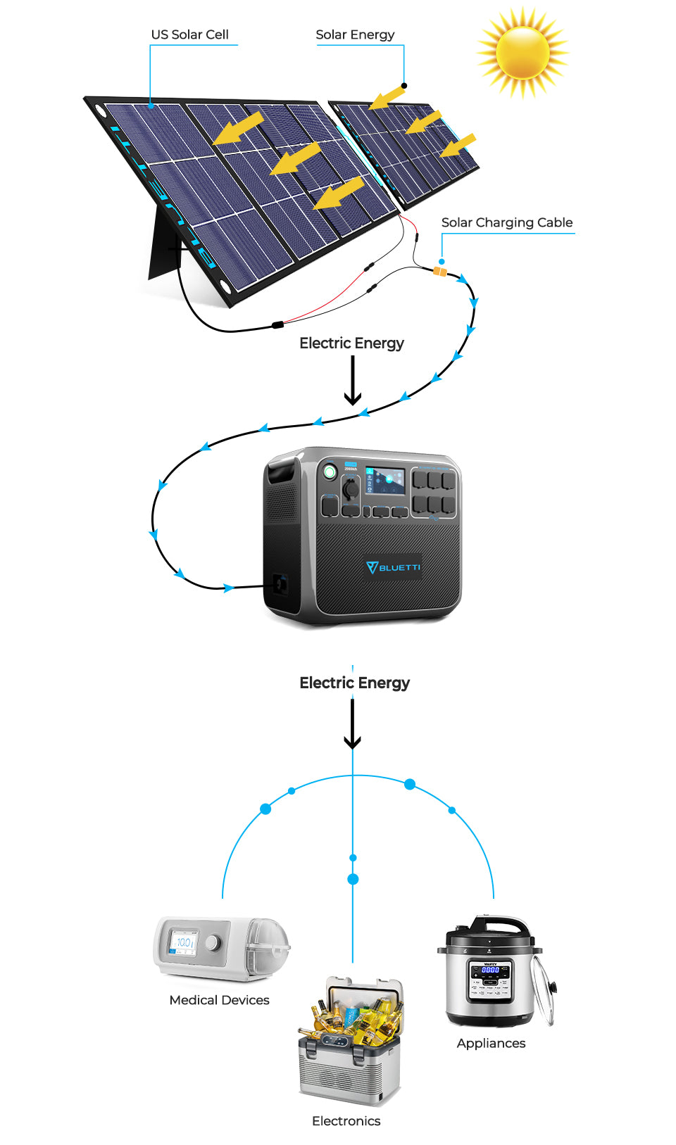By collecting solar energy through solar panels(either in series or parallel), a solar generator stores the energy in its built-in battery. Then the energy will be converted into alternating current (AC power) by an inverter, which can be released and available for home appliances and other electronic devices.