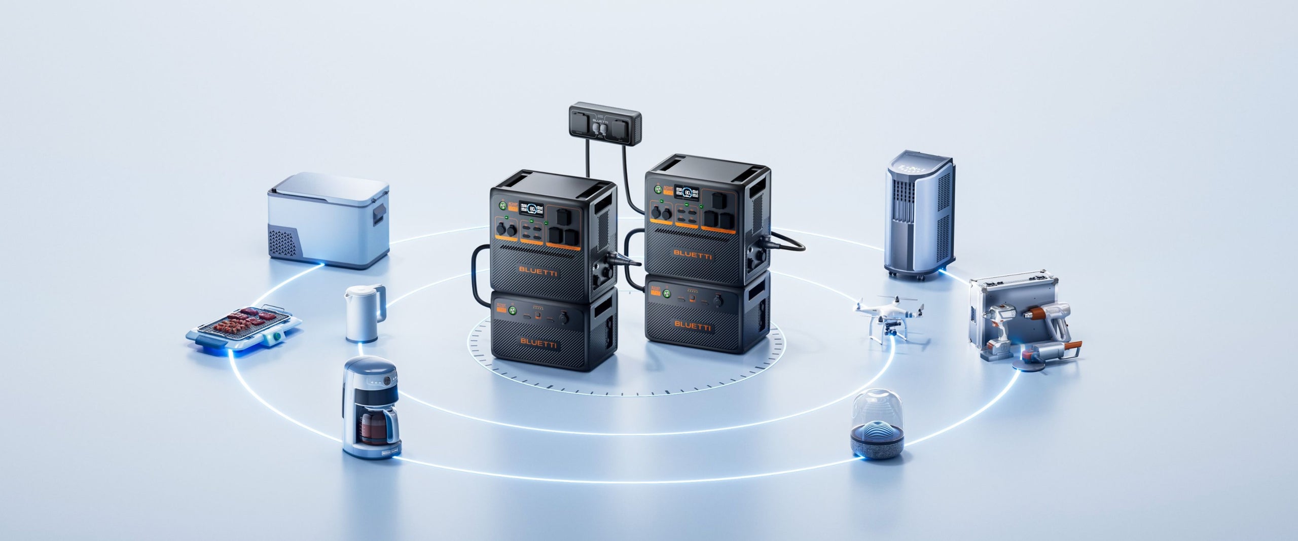 Note: 1. Connect the parallel ports on AC240P units via the P480A for Parallel Connection. 2. For high-power devices over 2,400W, please connect to the output ports of the P480A. 3. The P480A intelligently balances the capacity of 2 AC240P units without manual or app control. 4. Once the parallel charging cable disconnects, the AC240P units will shut down automatically for safety reasons.