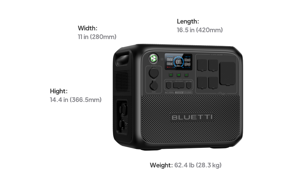 2048Wh5×120V (2200W Total)500W Max.900W Max.LiFePO₄ 3500+ CyclesBLUETTI App (Bluetooth)16.5x11.0x15.2 in61.9 lbs