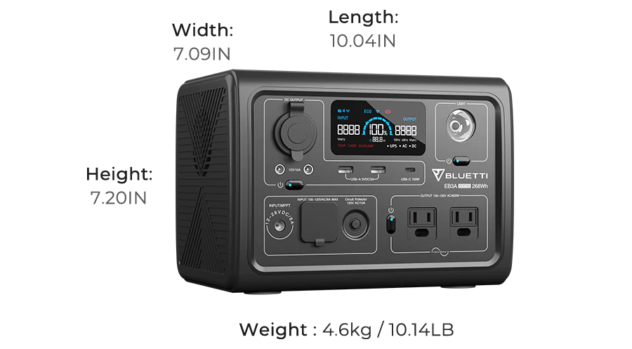 268Wh2x120V (600W Total)350W Max200W Max.LiFePO₄ 2500+ CyclesBLUETTI App (Bluetooth)10.0x7.1x7.2 in10.1 lbs
